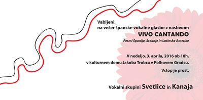 Vabljeni na večer španskih pesmi v KD Jakoba Trobca v Polhov Gradec, v nedeljo 3. aprila 2016 ob 18.00. Nastopili bosta vokalni skupini Svetlice in Kanaja z gosti, pod vodstvom Martine Kavčnik ob spremljavi vrhunskih instrumentalistov. Vstop je prost!