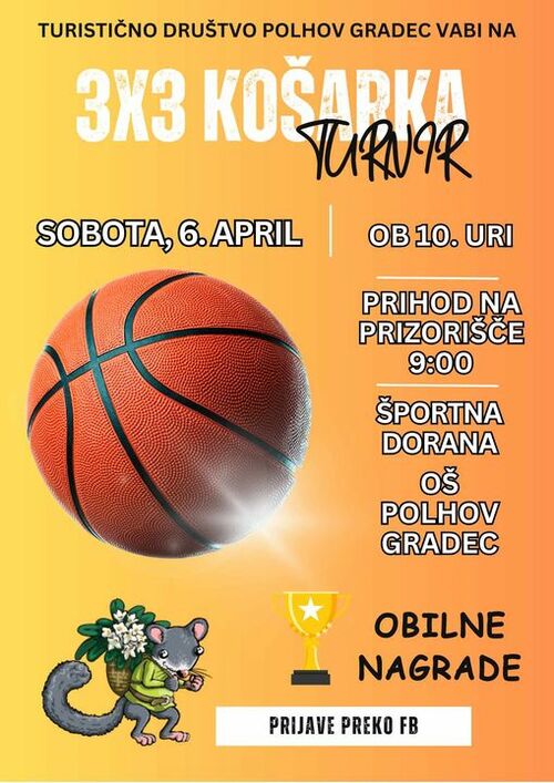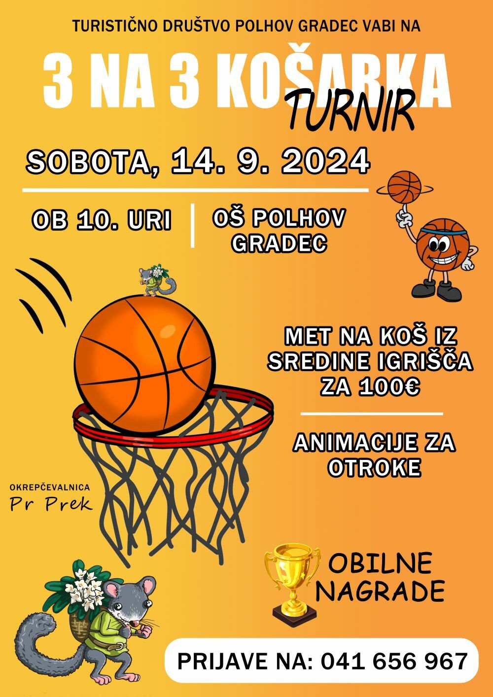 Turistično društvo Polhov Gradec vabi na turnir v košarki 3 na 3, ki bo 14. 9. 2024 s pričetkom ob 10ih v športni dvorani Osnovne šole Polhov Gradec.