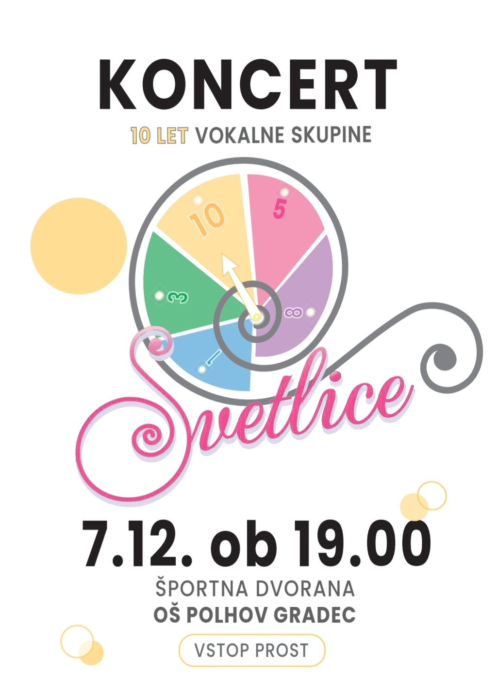 Ženska Vokalna skupina Svetlice delujemo pod okriljem Turističnega društva Polhov Gradec. Ob 10. obletnici delovanja naše skupine smo za vas pripravile poseben dogodek z naslovom Kolo sreče.